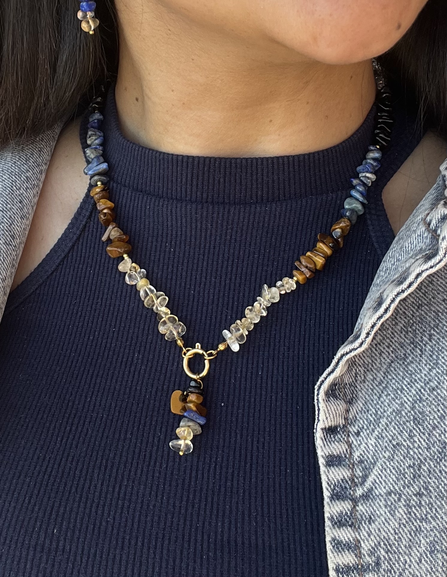 این گردنبند با ۵ نوع سنگ قابل اجراس و توجه داشته باشید هرچه تعداد نوع سنگ کم باشد و حجم هر سنگ زیاد باشد یعنی اگر کلا از یک سنگ مثلا سیترین استفاده شود انرژی این سنگ خیلی بیشتر است تا اینکه ۵ نوع سنگ کار شود و حجم هر سنگ کمتر باشد