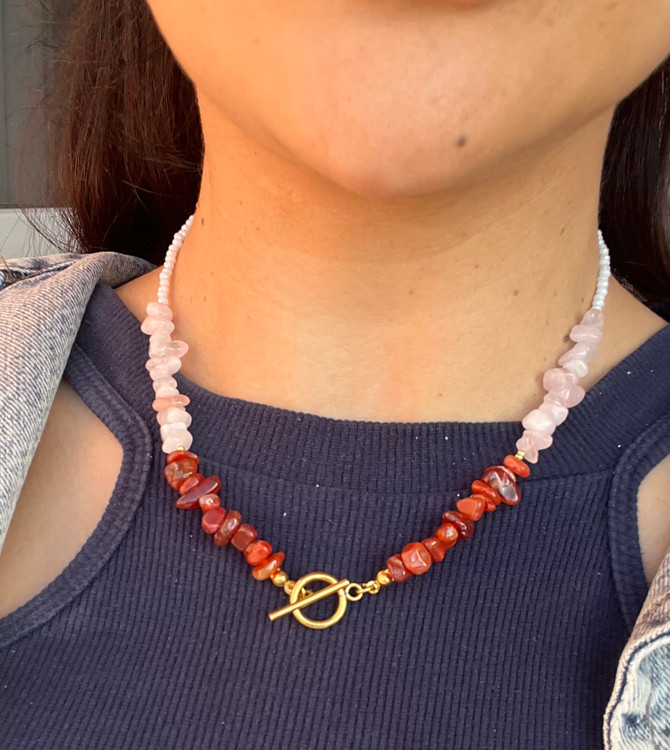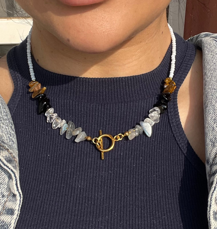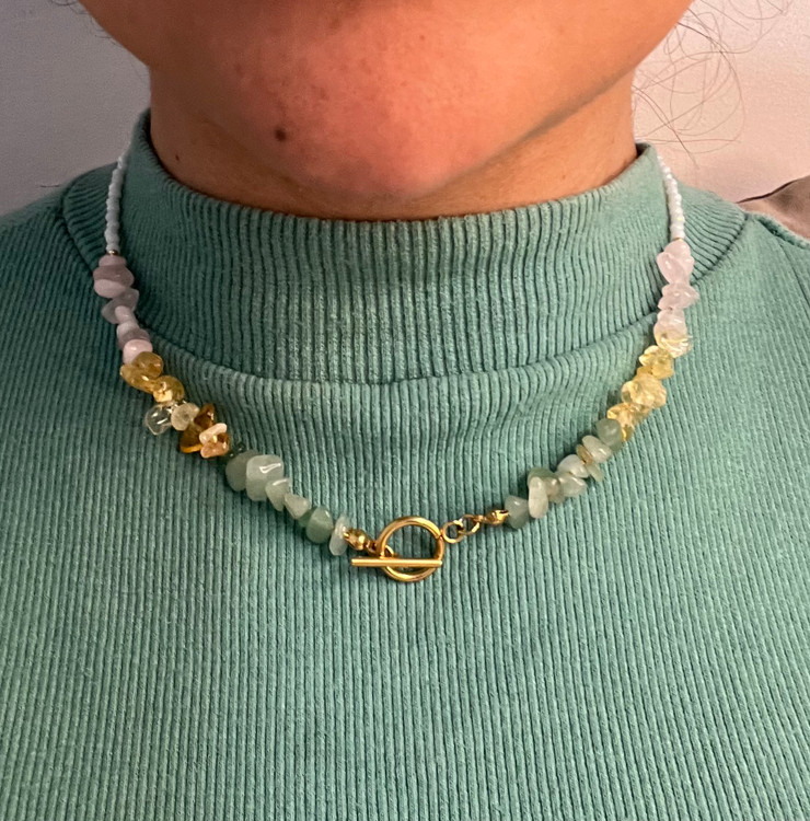 این گردنبند با سه نوع سنگ قابل اجراس و توجه داشته باشید هرچه تعداد نوع سنگ کم باشد و حجم هر سنگ زیاد باشد یعنی اگر کلا از یک سنگ مثلا سیترین استفاده شود انرژی این سنگ خیلی بیشتر است تا اینکه ۳ نوع سنگ کار شود و حجم هر سنگ کمتر باشد