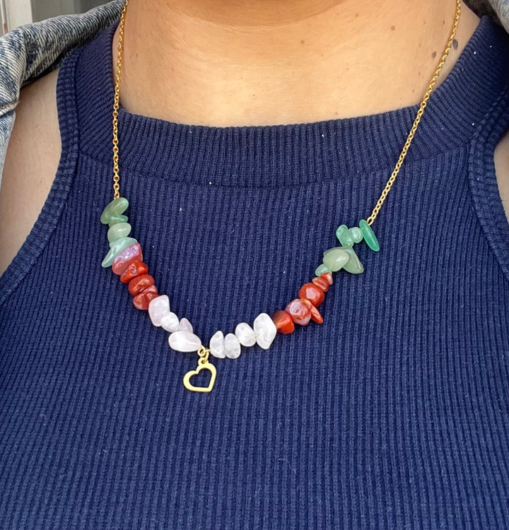 این گردنبند با سه نوع سنگ قابل اجراس و توجه داشته باشید هرچه تعداد نوع سنگ کم باشد و حجم هر سنگ زیاد باشد یعنی اگر کلا از یک سنگ مثلا سیترین استفاده شود انرژی این سنگ خیلی بیشتر است تا اینکه ۳ نوع سنگ کار شود و حجم هر سنگ کمتر باشد