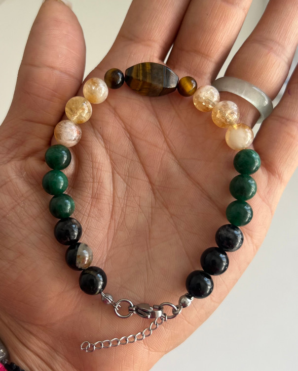 این دستبند با سه نوع سنگ قابل اجراس و توجه داشته باشید هرچه تعداد نوع سنگ کم باشد و حجم هر سنگ زیاد باشد یعنی اگر کلا از یک سنگ مثلا سیترین استفاده شود انرژی این سنگ خیلی بیشتر است تا اینکه ۳ نوع سنگ کار شود و حجم هر سنگ کمتر باشد
